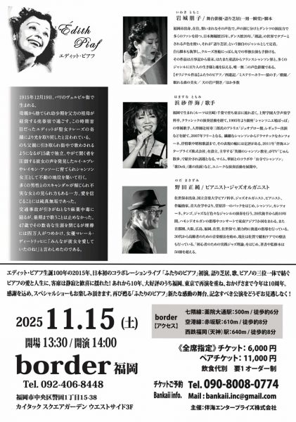 エディット・ピアフ生誕100年の2015年、日本初のコラボレーションライブ「ふたりのピアフ」初演。語り芝居、歌、ピアノの三位一体で紡ぐピアフの愛と人生に、客席は静寂と歓喜に撮れた!あれから10年、大好評のうち福岡、東京で再道を重ね、おかげさまで今年は10周年。